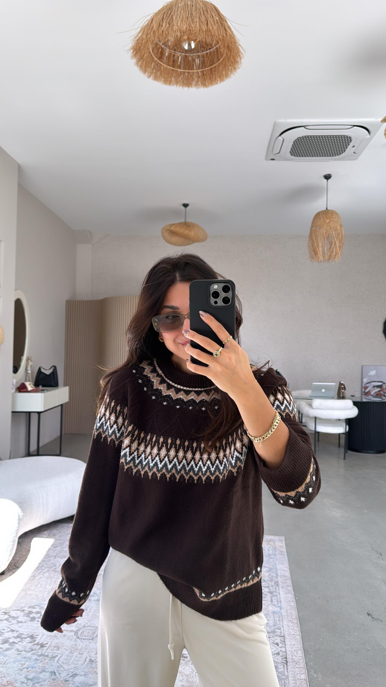 Kahverengi Desenli Yumuşak Dokulu Kazak