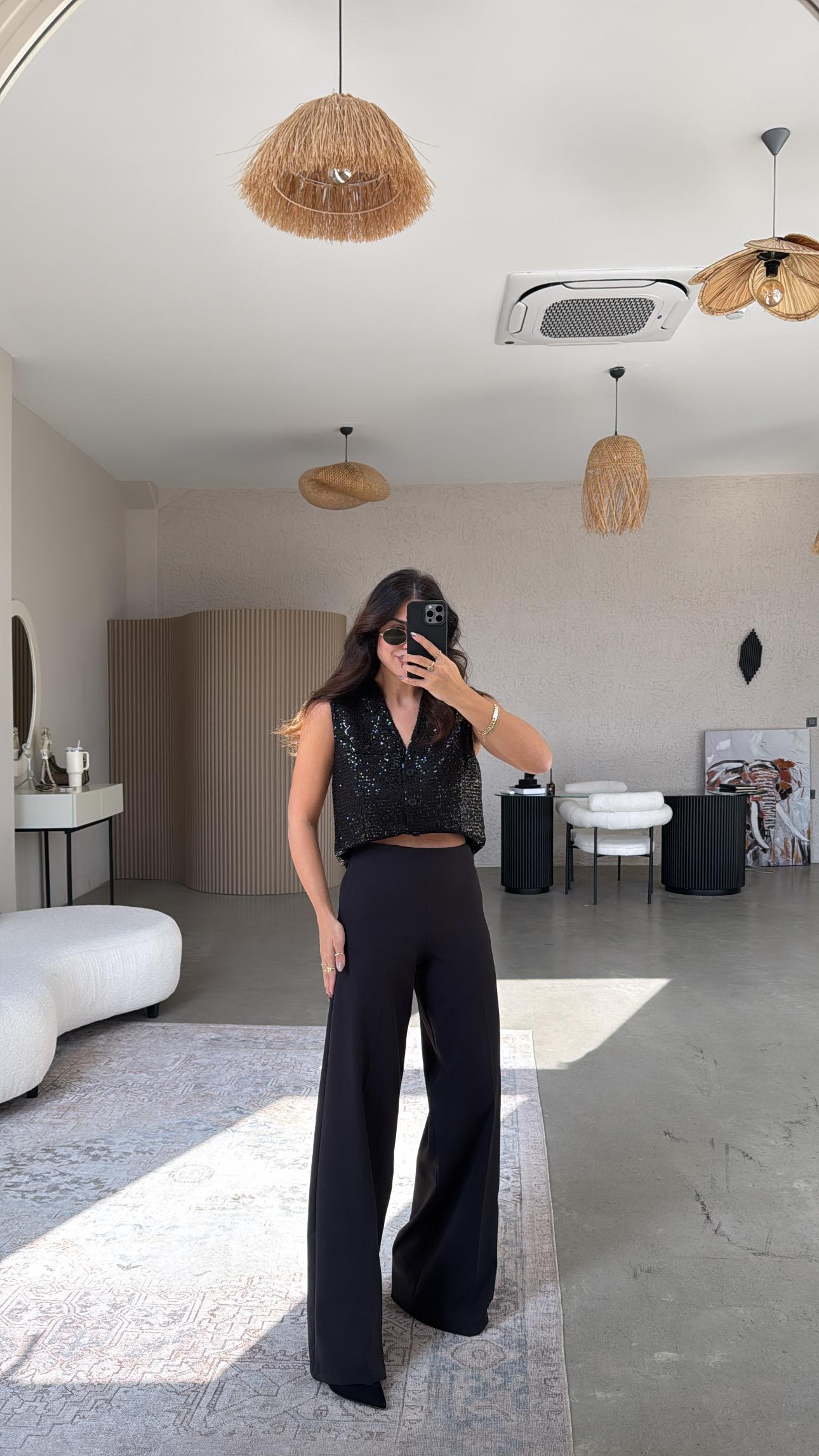 Siyah Gizli Fermuarlı Kemersiz Palazzo Pantolon